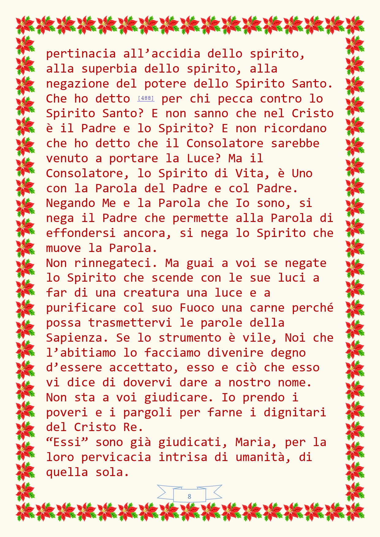 -Alla fine la scrittrice annota di aver ricevuto tra sofferenze atroci il “dettato” del giorno avanti e di avere scritto solo per la forza che le viene da Gesù.